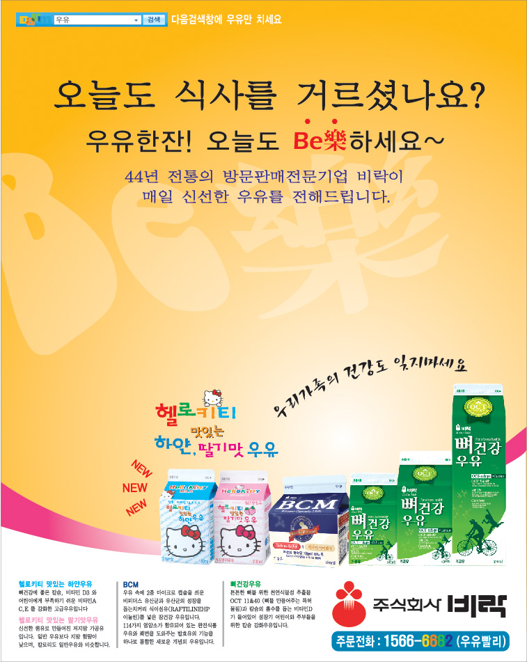 아래 작은설명은 윤신문인가요? 그냥 고딕으로 정렬해주시는게 깔끔할듯하구요 주식회사 비락로고 너무커보여요;; 우유광고인지 비락광고인지..촛점을 명확하게 잡고 레이아웃해야할듯 ;ㅁ;