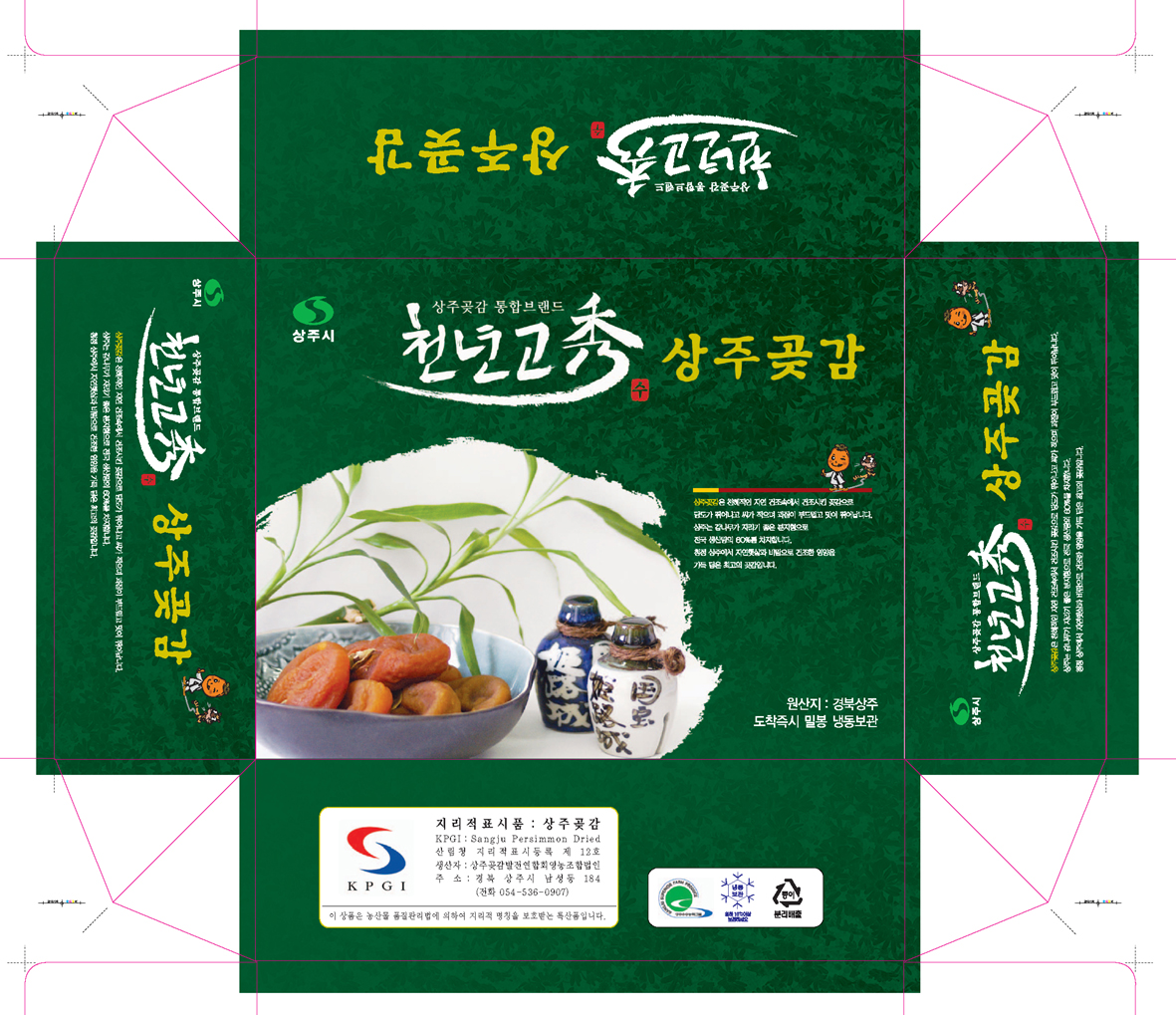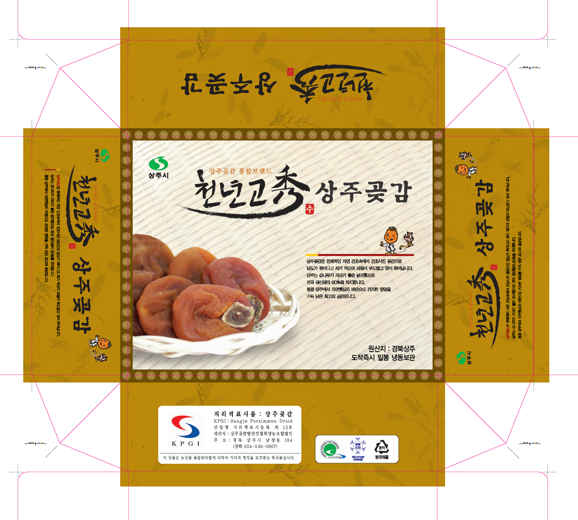 제품종류-->곶감...보다는 천년고수가 너무 눈에 띠는게 아닌가 싶은디... 그리고 주표시면(주로 윗 상단..제목이 들어가는 면)에 수량이라든가 g같은거 표기안해도 되나요? 식약청이던가...꼭(!)표기해야 한다고 하던디...